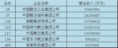 海航集團有限公司以1079.6億元的營收位列108名,中國南方航空集團公司以1025.1億元的營收居115位,中國航空集團公司以1020.6億元的營收排在第117位,中國東方航空集團公司以896.2億元的營收排在第134位。首都機場集團公司以203.7億元的營收排在第489位。