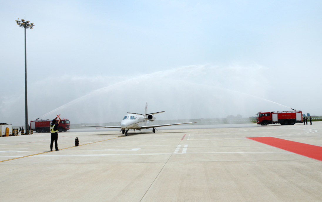 5月17日上午,隨著塔臺發出明確指令,一架“獎狀C560”平穩降落在安陽紅旗渠機場,并接受“水門禮”。這是中國民用航空飛行校驗中心的校驗專用飛機,它的到來意味著安陽紅旗渠機場“第一飛”順利完成,校飛工作正式開始,標志著安陽紅旗渠機場從地面建設向開放運行的邁進。