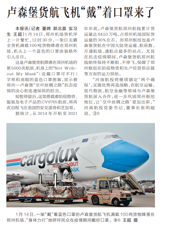 這是盧森堡貨航降落在鄭州機(jī)場(chǎng)的第5000次航班,機(jī)身上的“NotWith-outMyMask”(沒戴口罩可不行)字樣和亮眼的藍(lán)色口罩圖案,宣示著鄭州—盧森堡“空中絲綢之路”抗擊疫情的決心和連通保供的擔(dān)當(dāng)。