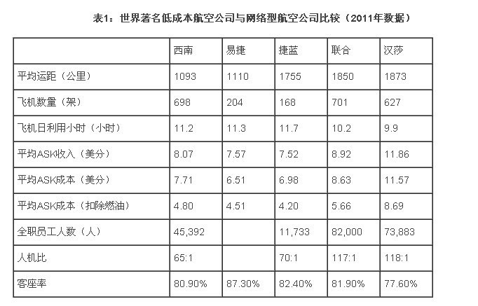 為了便于比較,本文選擇了我們普遍認可的低成本航空公司與較為熟悉的網絡型航空公司2011年的報表數據,分別從平均運距、機隊規模、飛機日利用率、平均ASK收入與成本、以及客座率與人機比等項目進行比較(如表1)。
